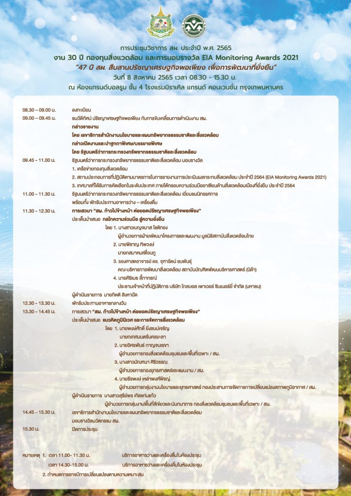 ร่วมรับชมการประชุมวิชาการ สผ. ประจำปี พ.ศ. 2565 งาน 30 ปี กองทุนสิ่งแวดล้อม และการมอบรางวัล EIA Mornitoring Awards 2021 ในธีม “47 ปี สผ. สืบสานปรัชญาเศรษฐกิจพอเพียง เพื่อการพัฒนาที่ยั่งยืน” ในวันที่ 8 สิงหาคม 2565 เวลา 08.30 – 15.30 น. ณ ห้องแกรนด์บอลรูม ชั้น 4 โรงแรมมิราเคิล แกรนด์ คอนเวนชั่น กรุงเทพมหานคร