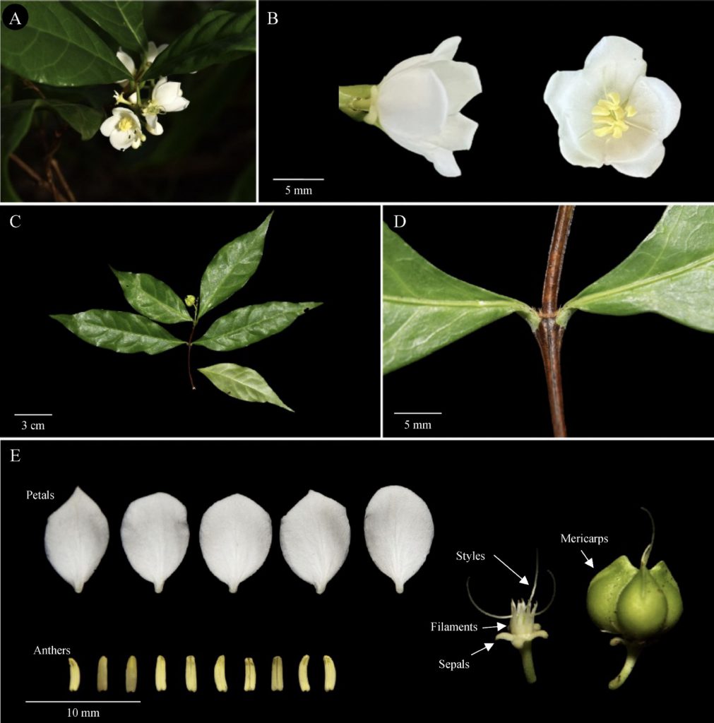 การค้นพบพืชชนิดใหม่ของโลก ได้รับการตั้งชื่อไทยว่า “ต้นต่างหูสิรินธร” อาศัยอยู่ป่าไม่ผลัดใบบนเขาหินปูน สูงประมาณ 50–150 เมตร ปัจจุบันพบเฉพาะในจังหวัดตรัง มีลักษณะดอกสีขาว ก้านดอกสั้น ผลย่อยยาวราว 6–7 มม. ช่วยแยกจากชนิดใกล้เคียงอย่าง B. curtisii ที่ดอกเหลืองและก้านดอกยาว ทีมผู้วิจัยเสนอจัดอยู่ในเกณฑ์ใกล้สูญพันธุ์ (EN) เพราะพื้นที่กระจายตัวแคบมาก และถิ่นอาศัยเสื่อมลงจากอากาศที่ร้อนและแห้งมากขึ้น