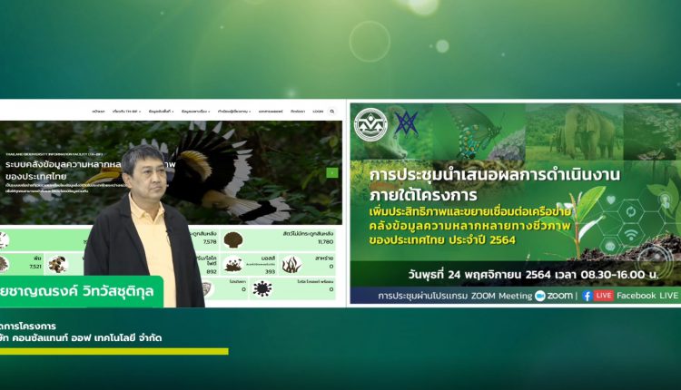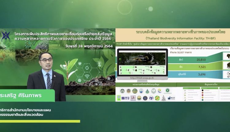 สำนักงานนโยบายและแผนทรัพยากรธรรมชาติและสิ่งแวดล้อม (สผ.) กองจัดการความหลากหลายทางชีวภาพ ร่วมกับบริษัท คอนซัลแทนท์ ออฟ เทคโนโลยี จำกัด ที่ปรึกษาโครงการ กำหนดจัดการประชุมนำเสนอผลการดำเนินงานภายใต้โครงการเพิ่มประสิทธิภาพและขยายเชื่อมต่อเครือข่ายคลังข้อมูลความหลากหลายทางชีวภาพของประเทศไทย ประจำปี 2564 ในวันพุธที่ 24 พฤศจิกายน 2564 เวลา 08.30-16.00 น. โดยเป็นการประชุมผ่านสื่ออิเล็กทรอนิกส์ (Zoom Meeting) ซึ่งมีวัตถุประสงค์เพื่อนำเสนอผลการดำเนินงานภายใต้โครงการเพิ่มประสิทธิภาพและขยายเชื่อมต่อเครือข่ายคลังข้อมูลความหลากหลายทางชีวภาพของประเทศไทย ประจำปี 2564 และรับฟังความเห็นข้อเสนอแนะจากภาคส่วนที่เกี่ยวข้องทั้งในส่วนกลางและส่วนภูมิภาค โดย ดร.พิรุณ สัยยะสิทธิ์พานิช เลขาธิการสำนักงานนโยบายและแผนทรัพยากรธรรมชาติและสิ่งแวดล้อม กล่าวเปิดการประชุม ดร.จิตตินันท์ เรืองวีรยุทธ ผู้อำนวยการกองจัดการความหลากหลายทางชีวภาพ กล่าวรายงาน และนายประเสริฐ ศิรินภาพร รองเลขาธิการสำนักงานนโยบายและแผนทรัพยากรธรรมชาติและสิ่งแวดล้อม บรรยายพิเศษ เรื่อง “TH-BIF กับบทบาทในฐานะศูนย์ข้อมูลกลางด้านความหลากหลายทางชีวภาพ” และรับฟังเสวนาจากผู้เชี่ยวชาญและวิทยากรจากหน่วยงานต่างๆ ในการเสวนา “ทิศทางการพัฒนาและใช้ประโยชน์ TH-BIF เพื่อการบริหารจัดการเชิงพื้นที่” และ “มุมมอง : การพัฒนาเชื่อมโยงข้อมูลระดับท้องถิ่นสู่การใช้ประโยชน์ในระดับประเทศ” ร่วมในการอภิปรายแลกเปลี่ยน ความคิดเห็น และตอบข้อซักถามต่างๆ ระหว่างวิทยากรและผู้เข้าร่วมการอบรม ประกอบด้วย ผู้เชี่ยวชาญ นักวิชาการด้านความหลากหลายทางชีวภาพ ด้านสารสนเทศ นักอนุกรมวิธาน และผู้แทนจากหน่วยงานเครือข่ายคลังข้อมูลความหลากหลายทางชีวภาพของประเทศไทยที่เกี่ยวข้องกับการดำเนินการด้านการจัดการเชิงพื้นที่ และหน่วยงานที่เกี่ยวข้อง จำนวนกว่า 190 คน