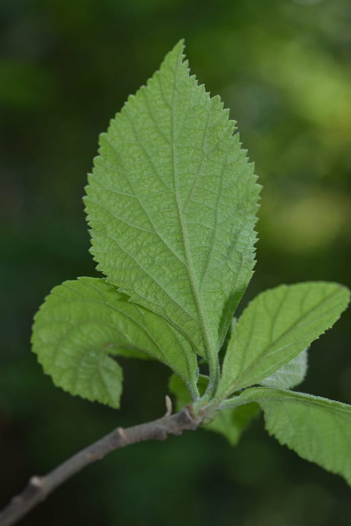 ขอบจักฟันเลื่อยถึงหยักซึ่ฟันไม่เป็นระเบียบ แผ่นใบบางคล้ายกระดาษ มีขนทั้ง 2 ด้าน เส้นแขนงใบข้างละ 3-7 เส้น ด้านบนนูนเล็กน้อย ด้านล่างนูนเด่นชัด ก้านใบยาว